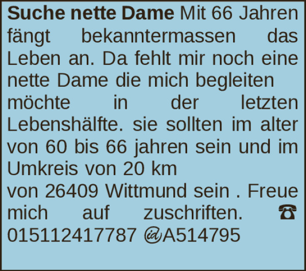 von 26409 Wittmund sein . Freue mich auf zuschriften.