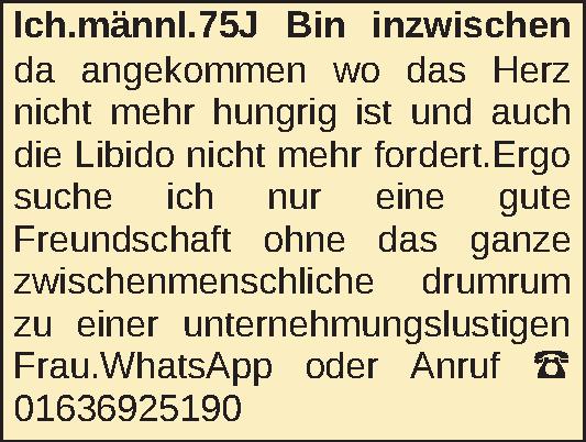 Bin inzwischen da angekommen wo das Herz nicht mehr hungrig ist und auch die Libido nicht mehr fordert.Ergo suche ich nur eine gute Freundschaft ohne das ganze zwischenmenschliche drumrum zu einer unternehmungslustigen Frau.WhatsApp oder AnrufKontakt
