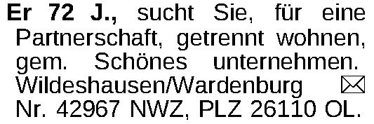Er 72 J., sucht Sie, für eine Partnerschaft, getrennt wohnen, gem. Schönes unternehmen. Wildeshausen/Wardenburg ¤ Nr. 42967 NWZ, PLZ 26110 OL.Kontakt