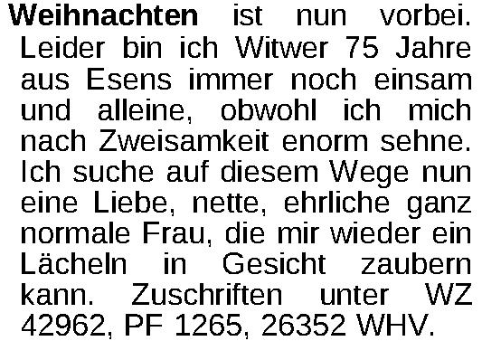 Weihnachten ist nun vorbei. Leider bin ich Witwer 75 Jahre aus Esens immer noch einsam und alleine, obwohl ich mich nach Zweisamkeit enorm sehne. Ich suche auf diesem Wege nun eine Liebe, nette, ehrliche ganz normale Frau, die mir wieder ein Lächeln in Gesicht zaubern kann. Zuschriften unter WZ 42962, PF 1265, 26352 WHV.