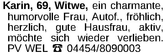 Witwe, ein charmante, humorvolle Frau, Autof., fröhlich, viels. interessiert, möchte sich wieder verlieben. PV WEL