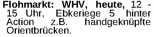 Flohmarkt: WHV, heute, 12 15 Uhr, Ebkeriege 5 hinter Action z.B. handgeknüpfte Orientbrücken.Kontakt