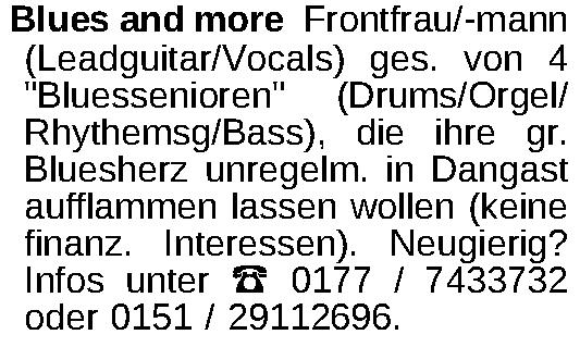 Blues and more Frontfrau/-mann (Leadguitar/Vocals) ges. von 4 "Bluessenioren" (Drums/Orgel/ Rhythemsg/Bass), die ihre gr. Bluesherz unregelm. in Dangast aufflammen lassen wollen (keine finanz. Interessen). Neugierig? Infos unter ‡ 0177 / 7433732 oder 0151 / 29112696.Kontakt