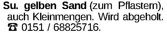 Su. gelben Sand (zum Pflastern), auch Kleinmengen. Wird abgeholt. ‡ 0151 / 68825716.Kontakt