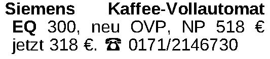 Siemens Kaffee-Vollautomat EQ 300, neu OVP, NP 518 € jetzt 318 €. 0171/2146730