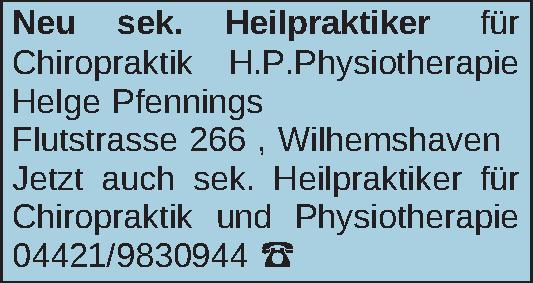 H.P.Physiotherapie Helge PfenningsFlutstrasse 266 , Wilhemshaven