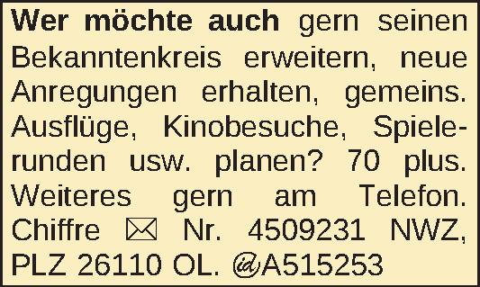 seinen Bekanntenkreis erweitern, neue Anregungen erhalten, gemeinsam Ausflüge, Kinobesuche, Spielerunden usw. planen? 70 plus. Weiteres gern am Telefon. Chiffre