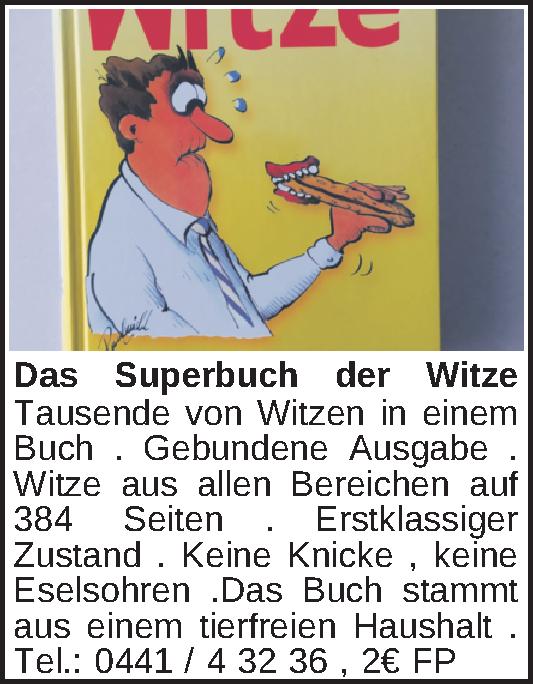 Tausende von Witzen in einem Buch . Gebundene Ausgabe . Witze aus allen Bereichen auf 384 Seiten . Erstklassiger Zustand . Keine Knicke , keine Eselsohren .Das Buch stammt aus einem tierfreien Haushalt .