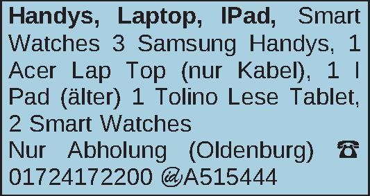 3 Samsung Handys, 1 Acer Lap Top (nur Kabel), 1 I Pad (älter) 1 Tolino Lese Tablet, 2 Smart WatchesNur Abholung (Oldenburg)