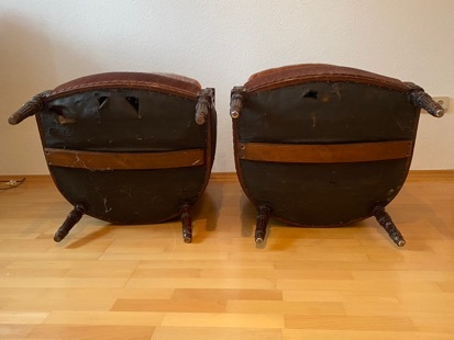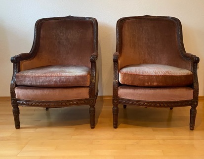 Wir verkaufen zwei antike geschnitzte Bergere-Sessel im französischen Louis-XVI.-Stil mit lachsfarbener Polsterung. Die Sessel sind sehr bequem, müssten aber restauriert werden. Tel. 0441/381076Kontakt