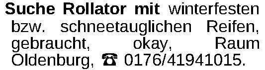 Suche Rollator mit winterfesten bzw. schneetauglichen Reifen, gebraucht, okay, Raum Oldenburg, ‡ 0176/41941015.Kontakt