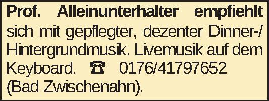 Prof. Alleinunterhalter empfiehlt sich mit gepflegter, dezenter Dinner-/ Hintergrundmusik. Livemusik auf dem Keyboard. ‡ 0176/41797652 (Bad Zwischenahn).Kontakt