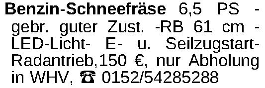Benzin-Schneefräse 6,5 PS gebr. guter Zust. -RB 61 cm LED-Licht- E- u. SeilzugstartRadantrieb,150 €, nur Abholung in WHV, ‡ 0152/54285288Kontakt