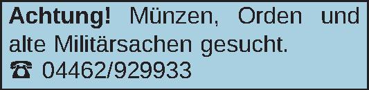Achtung! Münzen, Orden und alte Militärsachen gesucht. ‡ 04462/929933Kontakt