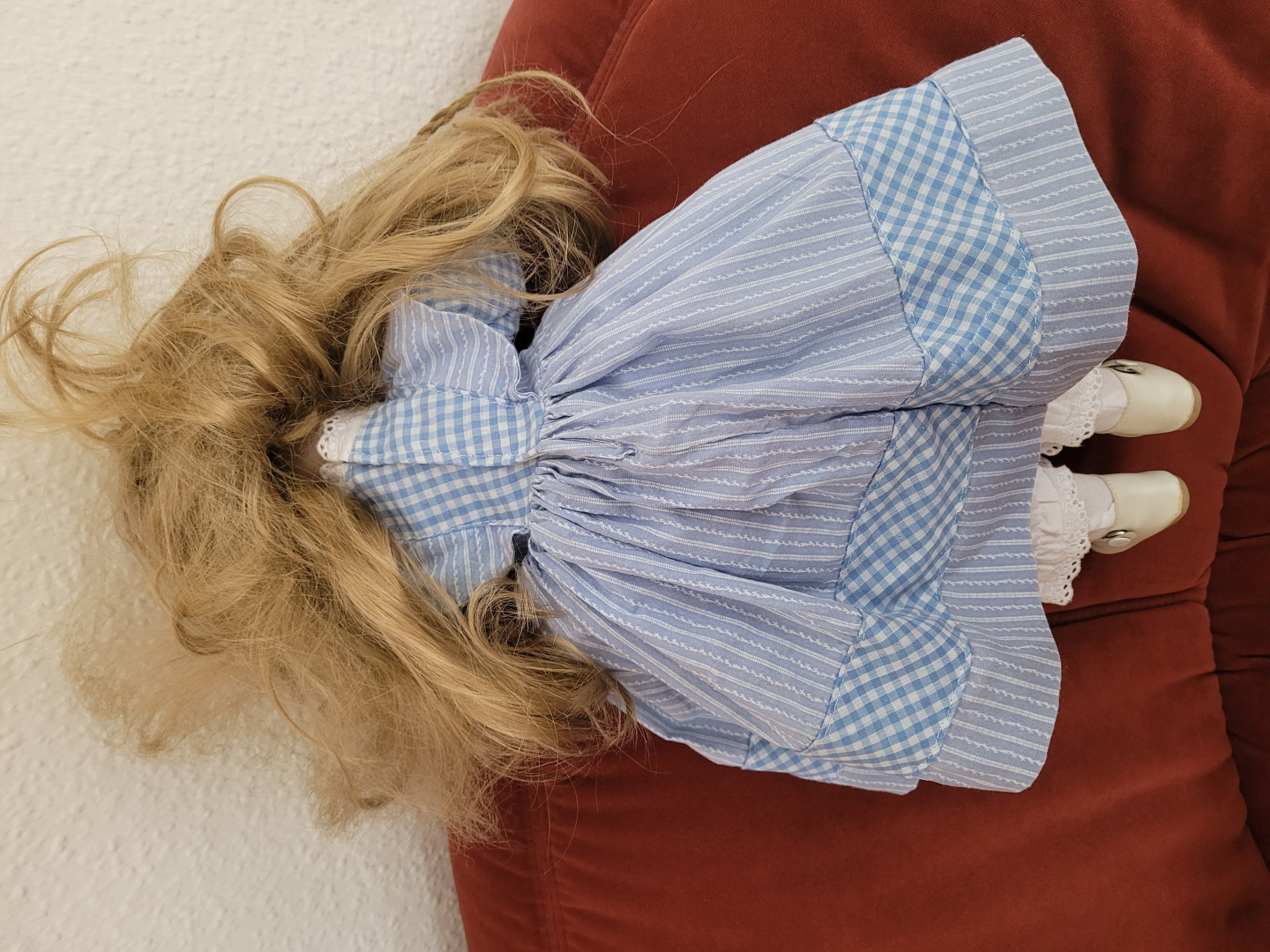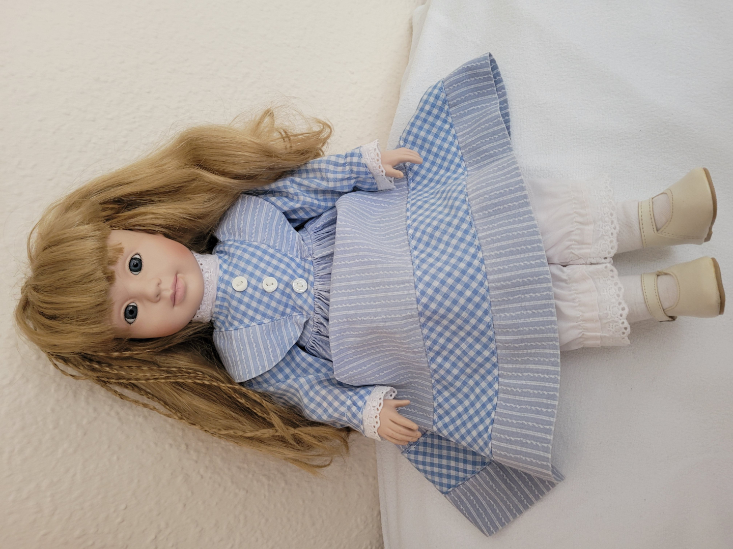 Puppe mit blonden Haaren in blau/ weißem Kleid zu verkaufen.Die Puppe ist neuwertig.