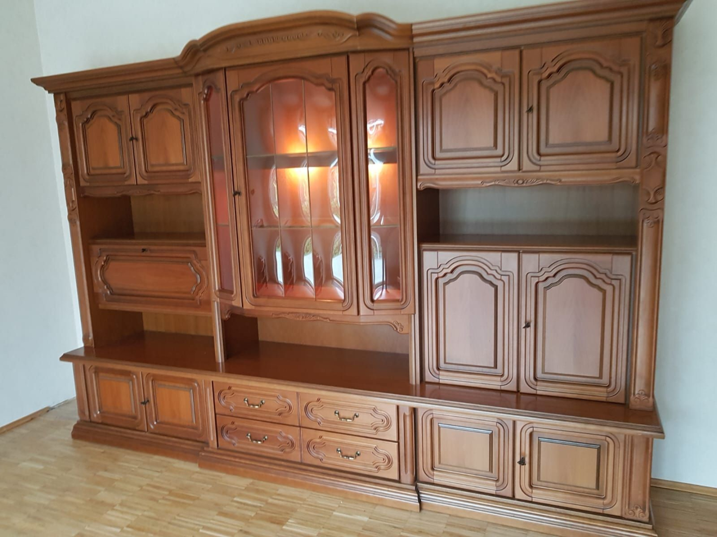 Verschenke sehr gut erhaltenen Wohnzimmerschrank aus mittelbraunem Holz. Der Schrank ist 3 m lang, 2,03 m hoch und 60 cm tief.In der Mitte befindet sich eine Glasvitrine (m. Beleuchtung), darunter 2 Schubladen für Besteck o.ä. Viel Stauraum für Gesc