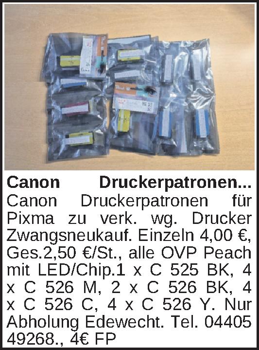 Canon Druckerpatronen für Pixma zu verk. wg. Drucker Zwangsneukauf.Einzeln 4,00 €, Ges.2,50 €/St., alle OVP Peach mit LED/Chip.1 x C 525 BK, 4 x C 526 M, 2 x C 526 BK, 4 x C 526 C, 4 x C 526 Y. Nur Abholung Edewecht. Tel. 04405 49268.