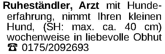 Ruheständler, Arzt mit Hundeerfahrung, nimmt Ihren kleinen Hund, (SH: max. ca. 40 cm) wochenweise in liebevolle Obhut ‡ 0175/2092693Kontakt