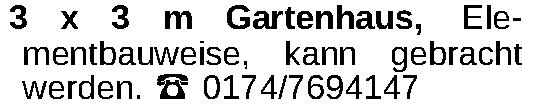 3 x 3 m Gartenhaus, Elementbauweise, kann gebracht werden. ‡ 0174/7694147Kontakt