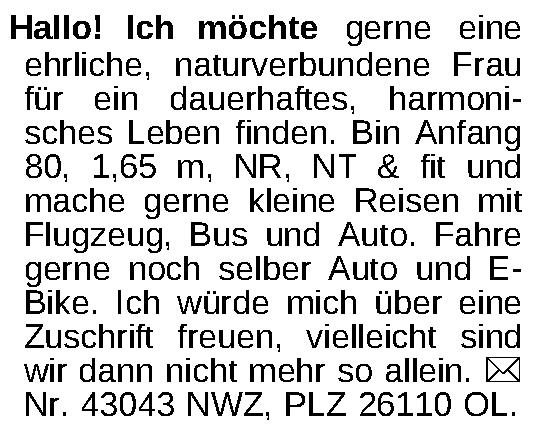 Hallo! Ich möchte gerne eine ehrliche, naturverbundene Frau für ein dauerhaftes, harmonisches Leben finden. Bin Anfang 80, 1,65 m, NR, NT & fit und mache gerne kleine Reisen mit Flugzeug, Bus und Auto. Fahre gerne noch selber Auto und EBike. Ich würde mich über eine Zuschrift freuen, vielleicht sind wir dann nicht mehr so allein. ¤ Nr. 43043 NWZ, PLZ 26110 OL.Kontakt