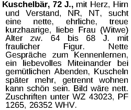 Kuschelbär, 72 J., mit Herz, Hirn und Verstand, NR, NT, sucht eine nette, ehrliche, treue kurzhaarige, liebe Frau (Witwe) Alter zw. 64 bis 68 J. mit fraulicher Figur. Nette Gespräche zum Kennenlernen, ein liebevolles Miteinander bei gemütlichen Abenden, Kuscheln später mehr, getrennt wohnen kann schön sein. Bild wäre nett. Zuschriften unter WZ 43023, PF 1265, 26352 WHV.Kontakt