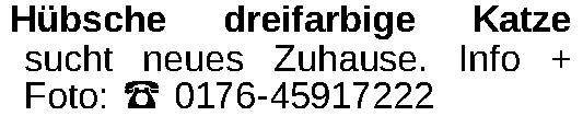 Hübsche dreifarbige Katze sucht neues Zuhause. Info + Foto: ‡ 0176-45917222Kontakt