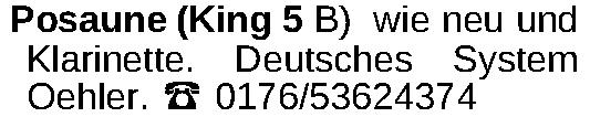 Posaune (King 5 B) wie neu und Klarinette. Deutsches System Oehler. ‡ 0176/53624374Kontakt