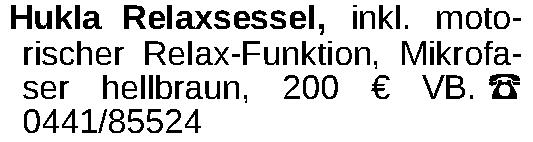 Hukla Relaxsessel, inkl. motorischer Relax-Funktion, Mikrofaser hellbraun, 200 € VB. ‡ 0441/85524Kontakt