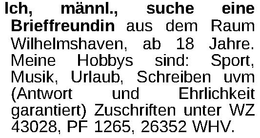 Ich, männl., suche eine Brieffreundin aus dem Raum Wilhelmshaven, ab 18 Jahre. Meine Hobbys sind: Sport, Musik, Urlaub, Schreiben uvm (Antwort und Ehrlichkeit garantiert) Zuschriften unter WZ 43028, PF 1265, 26352 WHV.Kontakt