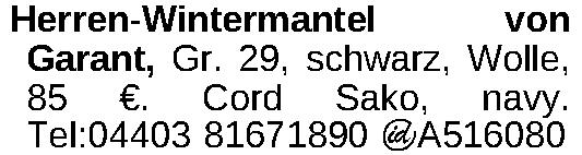 von Garant, Gr. 29, schwarz, Wolle. Cord Sako, navy. Tel:04403 81671890Kontakt