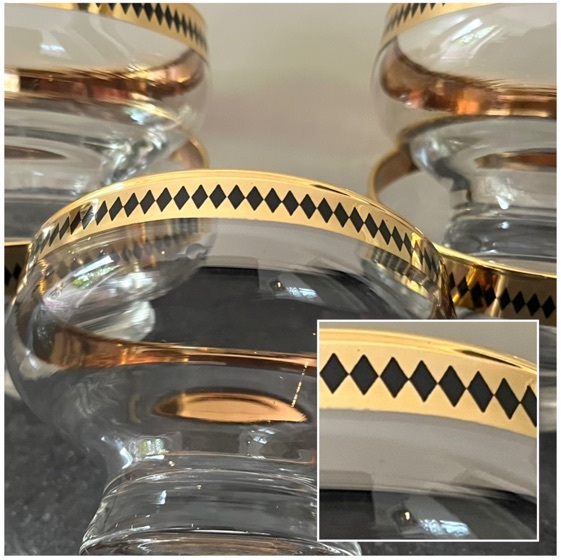 neuwertige Schälchen aus Glas mit dekorativem Goldrand und dunklem Rautenmuster. Auch schön für Dips etc. Tel. 015225606290.Kontakt