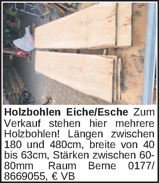 Zum Verkauf stehen hier mehrere Holzbohlen! Längen zwischen 180 und 480cm, breite von 40 bis 63cm, Stärken zwischen 60-80mm Raum Berne0177/8669055