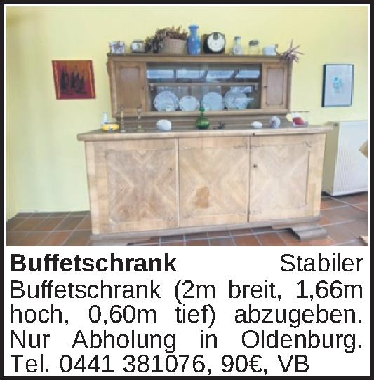 Stabiler Buffetschrank (2m breit, 1,66m hoch, 0,60m tief) abzugeben. Nur Abholung in Oldenburg. Tel. 0441 381076Kontakt