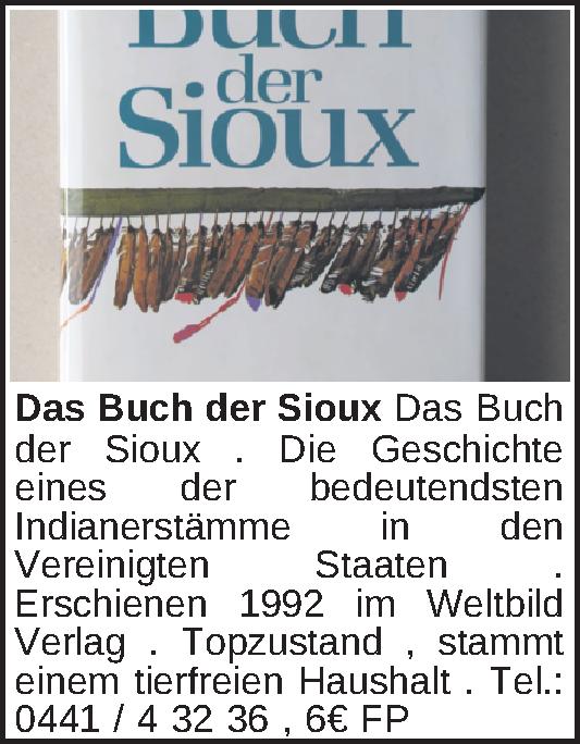 Das Buch der Sioux . Die Geschichte eines der bedeutendsten Indianerstämme in den Vereinigten Staaten . Erschienen 1992 im Weltbild Verlag . Topzustand , stammt einem tierfreien Haushalt .Tel.: 0441 / 4 32 36
