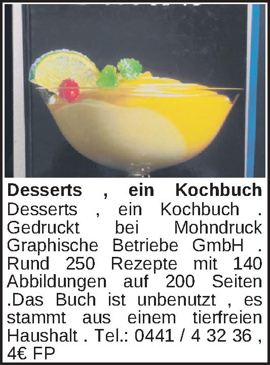 Desserts , ein Kochbuch . Gedruckt bei Mohndruck Graphische Betriebe GmbH . Rund 250 Rezepte mit 140 Abbildungen auf 200 Seiten .Das Buch ist unbenutzt , es stammt aus einem tierfreien Haushalt .Tel.: 0441 / 4 32 36