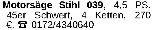 Motorsäge Stihl 039, 4,5 PS, 45er Schwert, 4 Ketten, 270 €. ‡ 0172/4340640Kontakt