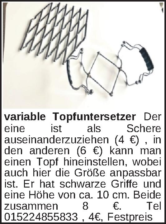 Der eine ist als Schere auseinanderzuziehen (4 €) , in den anderen (6 €) kann man einen Topf hineinstellen, wobei auch hier die Größe anpassbar ist. Er hat schwarze Griffe und eine Höhe von ca. 10 cm. Beide zusammen 8 €. Tel 015224855833Kontakt