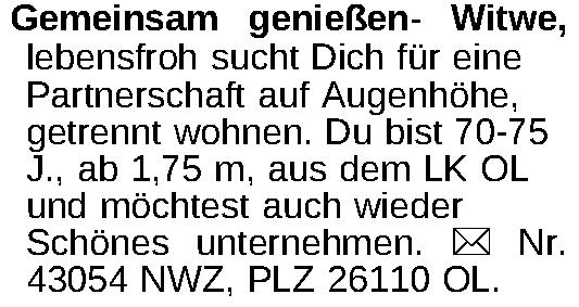 Gemeinsam genießen- Witwe, lebensfroh sucht Dich für eine Partnerschaft auf Augenhöhe, getrennt wohnen. Du bist 70-75 J., ab 1,75 m, aus dem LK OL und möchtest auch wieder Schönes unternehmen. ¤ Nr. 43054 NWZ, PLZ 26110 OL.Kontakt