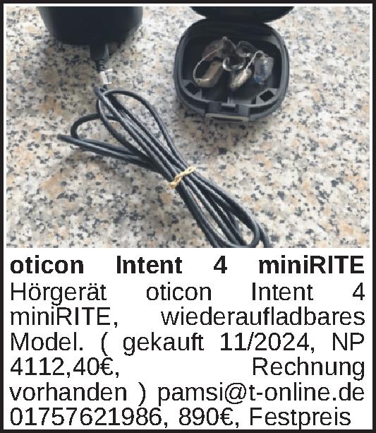 Hörgerät oticon Intent 4 miniRITE, wiederaufladbares Model. ( gekauft 11/2024, NP 4112,40€, Rechnung vorhanden )pamsi@t-online.de