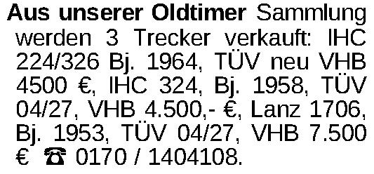Aus unserer Oldtimer Sammlung werden 3 Trecker verkauft: IHC 224/326 Bj. 1964, TÜV neu VHB 4500 €, IHC 324, Bj. 1958, TÜV 04/27, VHB 4.500,- €, Lanz 1706, Bj. 1953, TÜV 04/27, VHB 7.500 € ‡ 0170 / 1404108.Kontakt