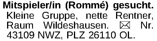 Mitspieler/in (Rommé) gesucht. Kleine Gruppe, nette Rentner, Raum Wildeshausen. ¤ Nr. 43109 NWZ, PLZ 26110 OL.Kontakt