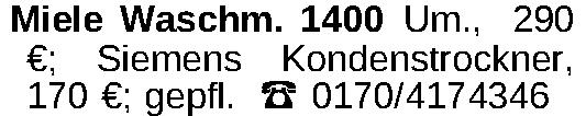 Miele Waschm. 1400 Um., 290 €; Siemens Kondenstrockner, 170 €; gepfl. 0170/4174346