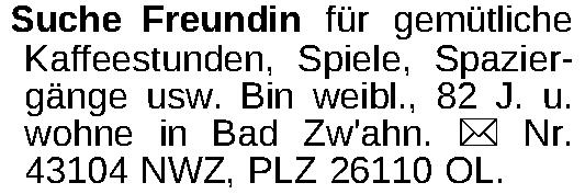 Suche Freundin für gemütliche Kaffeestunden, Spiele, Spaziergänge usw. Bin weibl., 82 J. u. wohne in Bad Zw'ahn. ¤ Nr. 43104 NWZ, PLZ 26110 OL.Kontakt