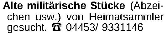 Alte militärische Stücke (Abzeichen usw.) von Heimatsammler gesucht. 04453/ 9331146