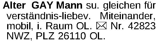 Alter GAY Mann su. gleichen für verständnis-liebev. Miteinander, mobil, i. Raum OL. ¤ Nr. 42823 NWZ, PLZ 26110 OL.