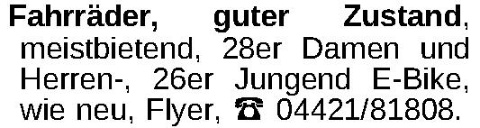 Fahrräder, guter Zustand, meistbietend, 28er Damen und Herren-, 26er Jungend E-Bike, wie neu, Flyer, ‡ 04421/81808.Kontakt