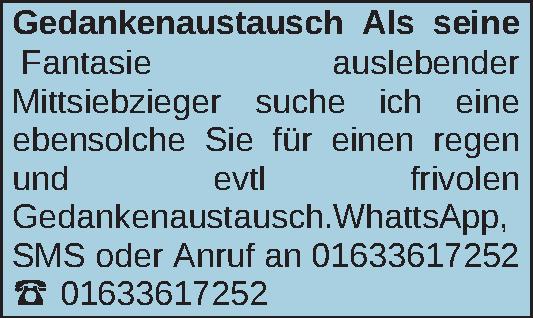 Als seine Fantasie auslebender Mittsiebzieger suche ich eine ebensolche Sie für einen regen und evtl frivolen Gedankenaustausch.WhattsApp,SMS oder Anruf an 01633617252Kontakt