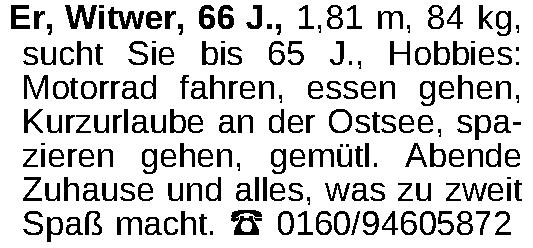 Er, Witwer, 66 J., 1,81 m, 84 kg, sucht Sie bis 65 J., Hobbies: Motorrad fahren, essen gehen, Kurzurlaube an der Ostsee, spazieren gehen, gemütl. Abende Zuhause und alles, was zu zweit Spaß macht. ‡ 0160/94605872Kontakt