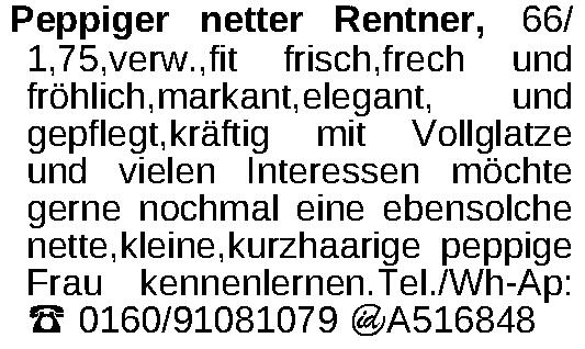 67/1,75,frisch,frech und fröhlich,elegant und gepflegt,kräftig mit Glatze und vielen Interessen möchte nochmal eine ebensolche nette,kleine Frau kennenlernen.Tel./Wh-Ap:0160/91081079.