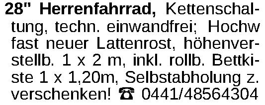 28" Herrenfahrrad, Kettenschaltung, techn. einwandfrei; Hochw fast neuer Lattenrost, höhenverstellb. 1 x 2 m, inkl. rollb. Bettkiste 1 x 1,20m, Selbstabholung z. verschenken! ‡ 0441/48564304Kontakt